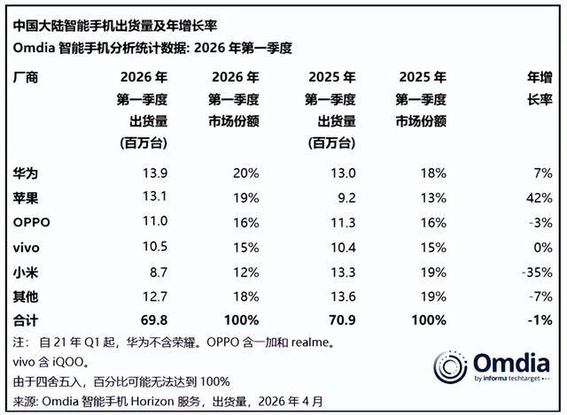 知名的全球技术市场研究咨询机构Omdia,发布了2026年第一季度中国大陆智能手机市场的具体数据。
