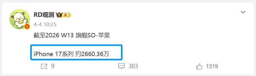 根据博主"RD观测"的数据,截至第13周,iPhone17系列销量达到了2660万台。